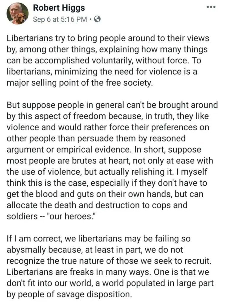 I saw a post today from the powerful mind of anarchist thinker, writer, and speaker Robert Higgs, which set me down a new path of questioning.
