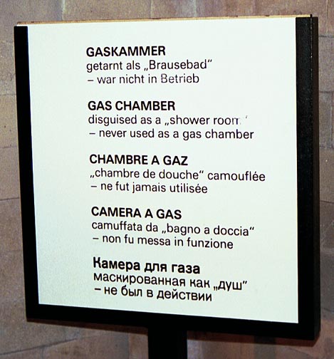 The above screenshot from the USHMM website notes that “there is no credible evidence that the gas chamber in Barrack X [at Dachau] was used to murder human beings.” An image from the Dachau museum itself shows a sign saying: “never used as a gas chamber” (see image directly below).