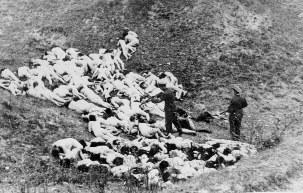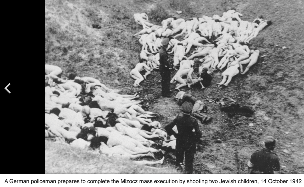 The image above depicts members of the Nazi Einsatzgruppen mobile killing unit murdering perceived opponents. The following images from the Mizoch Ghetto executions are especially disturbing, but it is important they are seen: