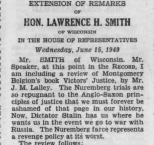 If you’ve read this far, I commend you. To close this exploration which will probably lose me followers, I circle back to the U.S. congressional record, where representative Lawrence H. Smith quotes a book review of Montgomery Belgion’s Victor’s Justice. The reviewer notes: