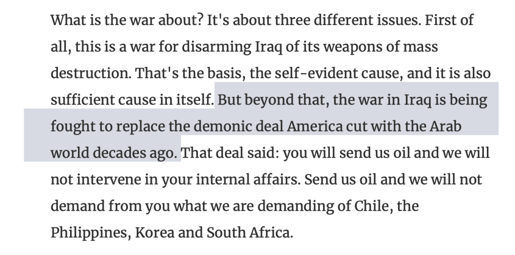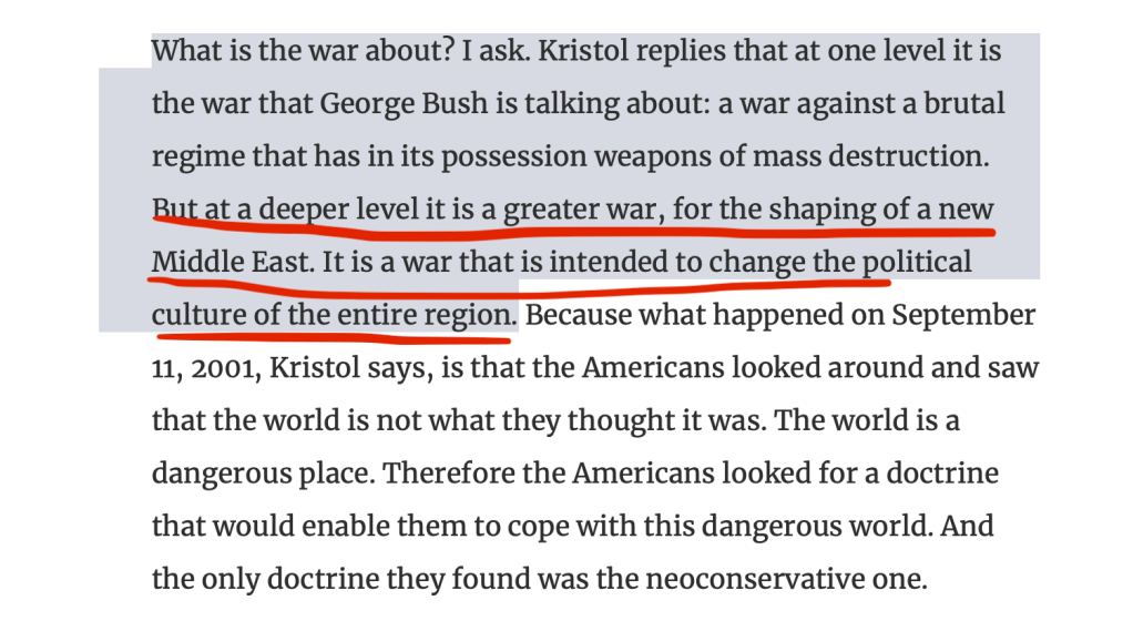 What did the late Pulitzer Prize-winning Washington Post journalist Charles Krauthammer have to say about the reason for the war? Well, he gives brief lip service to the supposed weapons of mass destruction which were never found, but “beyond that” or “at a deeper level” as Kristol said above, it was demonic deals with Arabs: