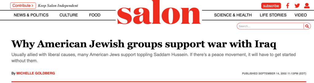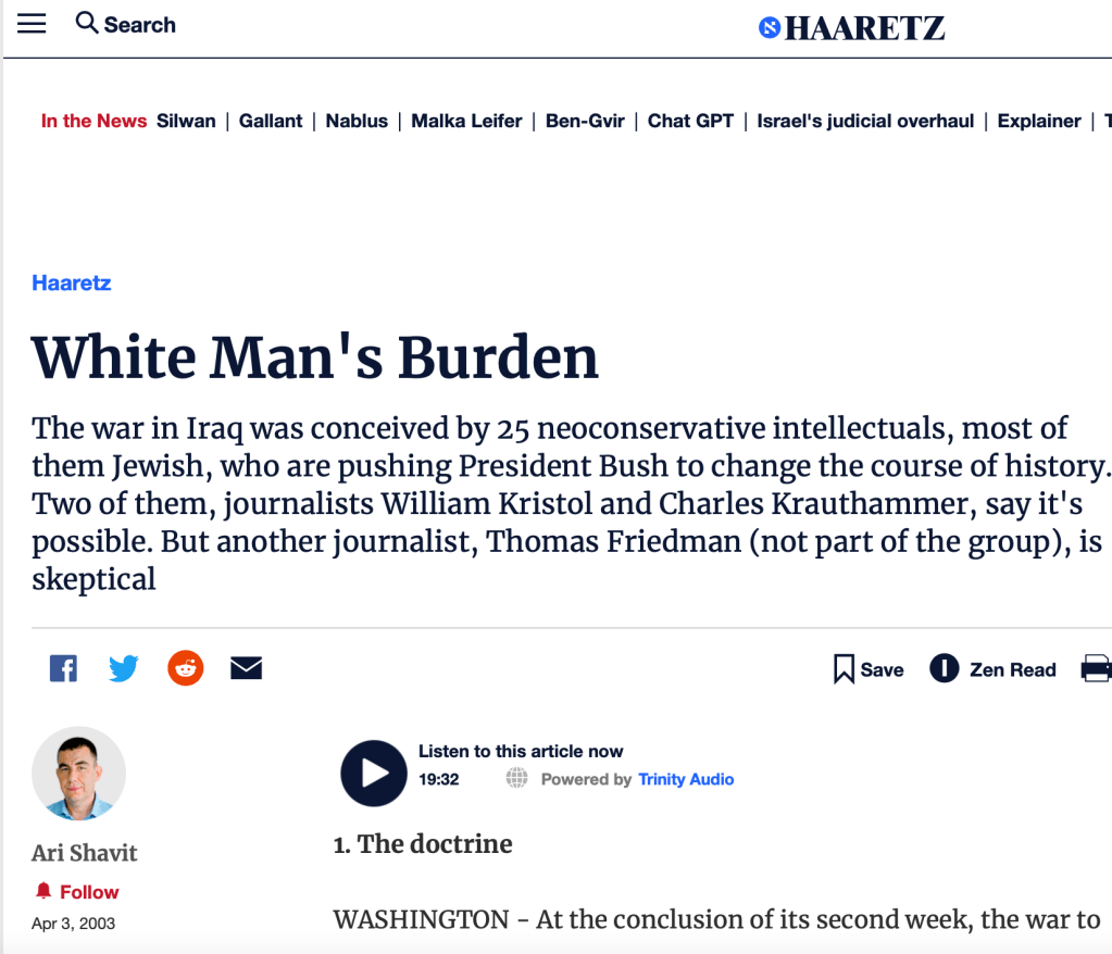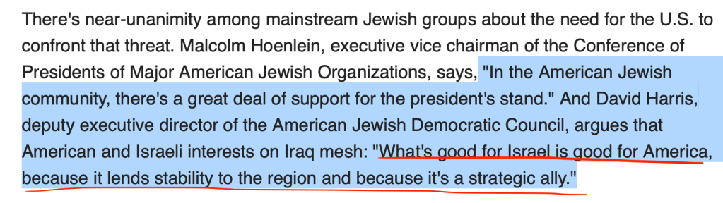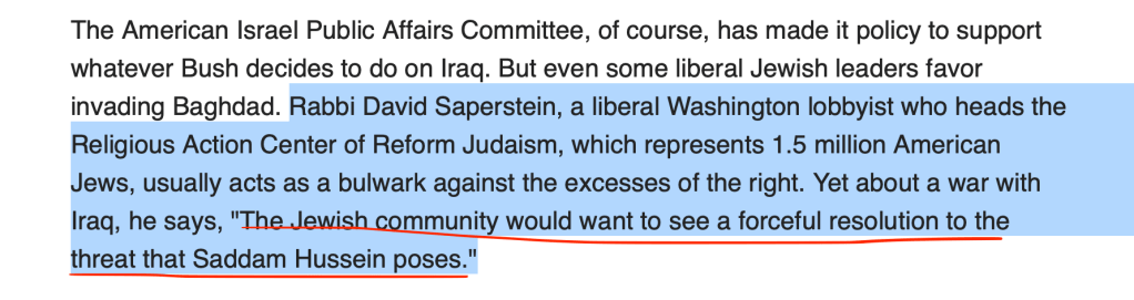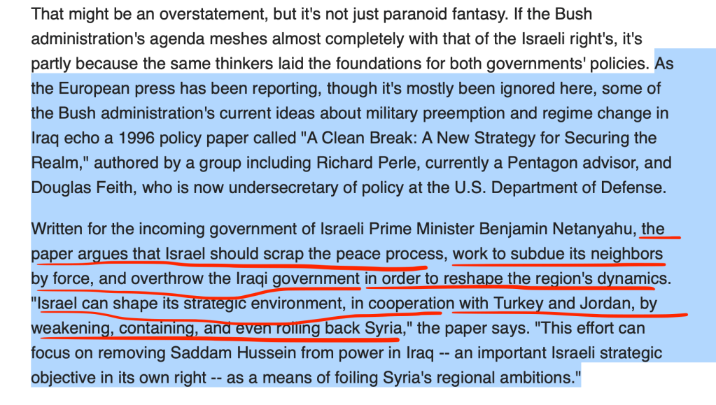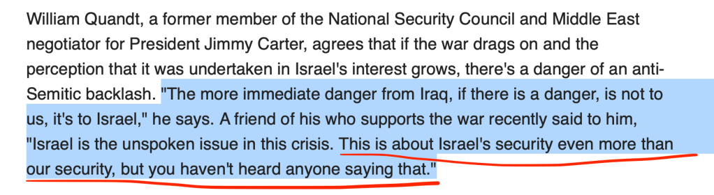 Haaretz in April 2003 — Here’s a Jewish publication saying the Iraq war was largely a Jewish idea, alluding to the idea it was done to help secure the state of Israel. Combine that with the American exceptionalist bullshit about “spreading democracy” (which is a horrible idea anyway, as democracy is merely a euphemism for violent, mob rule), and a whole bunch of gov-worshipping Bible beaters gung-ho to “support the holy land” and bam. One mass murder for GAWD AND CUNTRY, coming right up.