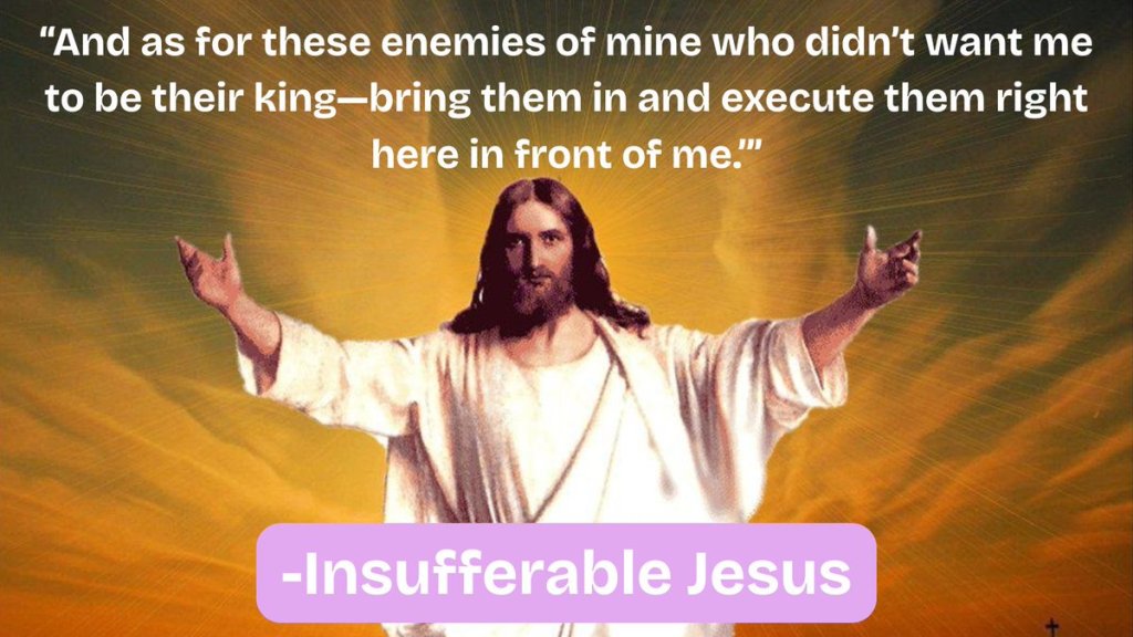 See: Luke 19: 27. Other examples: Deuteronomy 19: 11-14, Revelation 19: 13-15/Isaiah 63: 1, Numbers 31: 17, 18. (Note: In Revelation/Isaiah, the messiah figure is covered in the blood of the “ethnē” — the non-Jewish ethnic groups, referred to in modern translations as the “nations”).