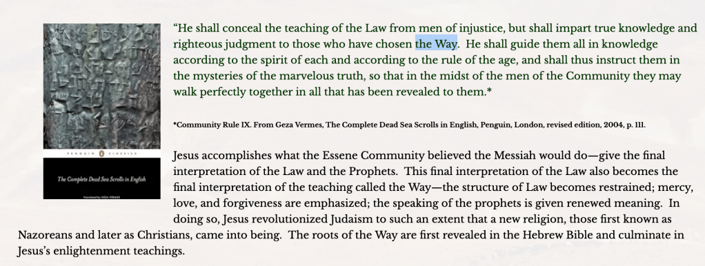The Essenes lived in the wilderness, practiced baptism/ritual purification in water long before the advent of Christianity, and forsook the company of society and women. Sounds a lot like John the Baptist. Essenism was also known as “the Way” as evidenced by the Dead Sea Scrolls. This idea of the “Way” as a sect is also found in the Bible. Please read the screenshot below carefully. Here is the link.