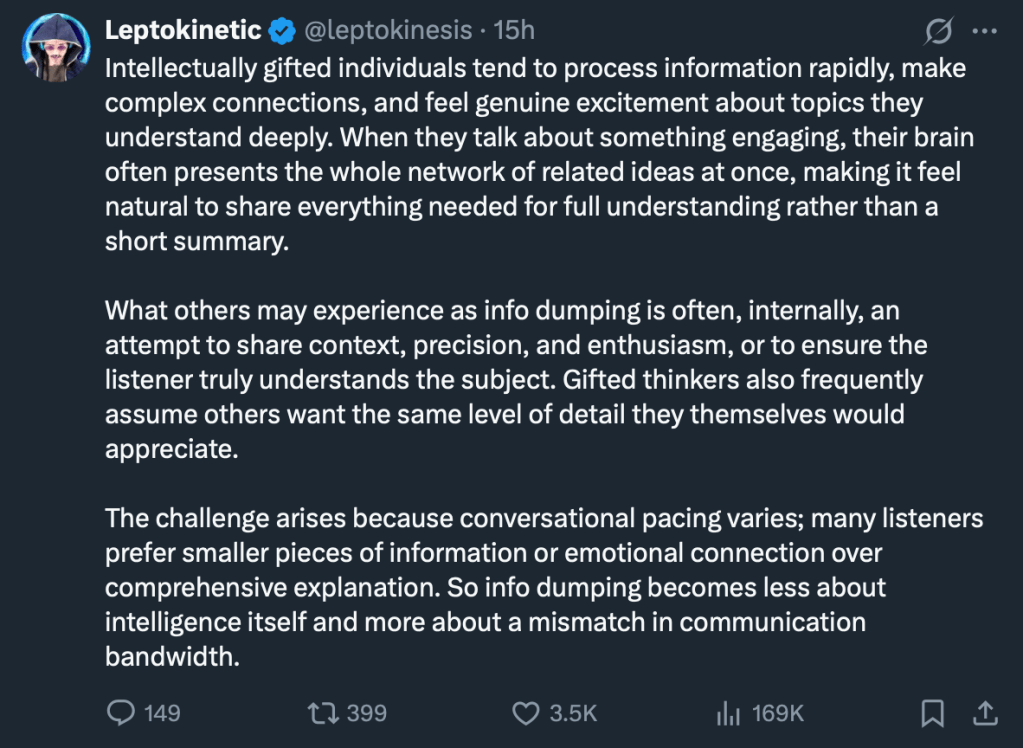 I found this the other day. It is so dead-on accurate I had to share. I am not posting this to say I am “intellectually gifted,” but to say this is why I share so much information at once, so often, in conversation or correspondence. To me, and those like me, it is not “oversharing” at all, but a sensible and enthusiastic way to convey information, feelings, and ideas.